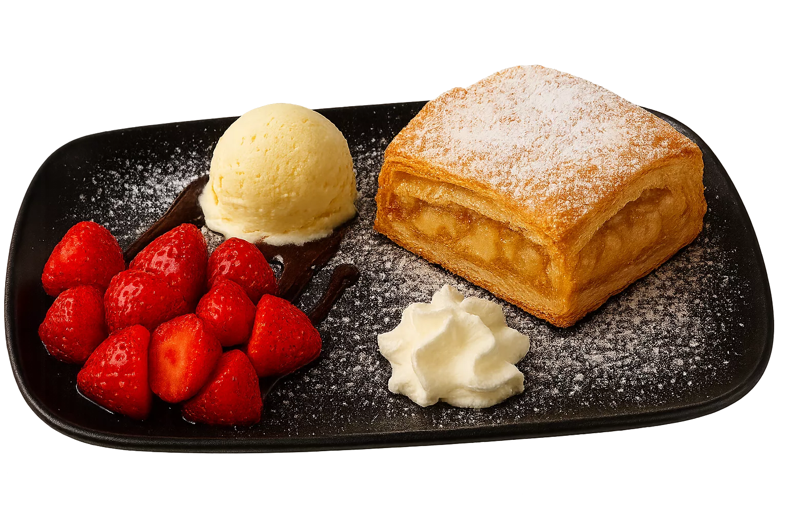 Warmer Strudel mit saftiger Apfelfüllung, mit Eis und Sahne – ein echter Klassiker, am besten mit Vanillesoße oder Eis.